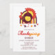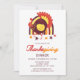 A colourful Thanksgiving Dinner Invitation card featuring a cute turkey with a colourful rainbow and some autumn leaves.