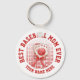 This stylish BASEBALL MOM Custom Name keychain with CUSTOMIZABLE TEXT is a perfect Mother's Day gift for Baseball Moms. The design shows the words BASEBALL MOM in a repeating fading pattern. On the top there is a beige baseball glove (or baseball mit) with red baseball and decorated with a red bow, which alludes to the trending coquette niche. The CUSTOMIZABLE TEXT reads BEST BASEBALL MOM EVER plus placeholder name, which you can PERSONALIZE by adding your name or other text. This baseball keychain would make an ideal favour gift or stocking stuffer for Baseball Moms. Matching apparel and gifts are available so you can create some awesome gift boxes.