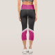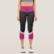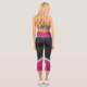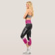 These black modern workout leggings feature an elegant and delicate white floral design on a dark magenta background on the waistband and on the legs.