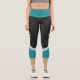 These black and teal blue stylish workout leggings feature an elegant white floral design on a teal blue background on the waistband and on the legs with white stripes.