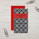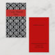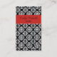 Elegant ladies business card, done in a black and white damask pattern. A red bold stripe, across the top, and the solid red back has black text ready to personalise with your information. A lovely stand out card great for any kind of occupation or business.