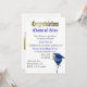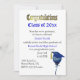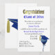 Blue school colour themed graduation party invitation done in white, with graphics of a festive blue and gold balloon, with a mortarboard cap on it, in the lower right corner of the invitation. Gold tone graphic text reading Congratulations, runs across the top of the invitation, with blue text reading Class of 20xx ready to personalise. Personalise the rest of the invitation's text to suit your party needs. Matching party supplies are available.