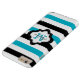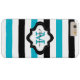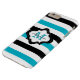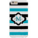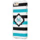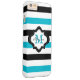 Personalise this cool modern striped iPhone 6 plus case with your custom monogram initial letter and name to make it truly unique and one of a kind. The chic iPhone cover has a quatrefoil design label in black and white over the turquoise blue,black and white striped pattern. Click the "Customise It" button to make changes in name and monogram text colour,size or font.