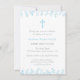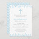 A modern and stylish Christening or Baptism invitation in pastel blue. Design has the holy cross in the centre and decorative leaves for the border. On the reverse page is a pastel blue and white chevron zigzag pattern. Personalise easily with event details for baptism of baby boy.