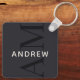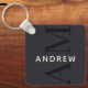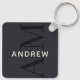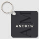 This stylish blue keychain features a modern layout with vertical monogram in big type, and your name in simple creamy white horizontal type.