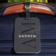 This stylish dark blue luggage tag feature a modern layout with vertical monogram in big type, and your name in prominent creamy white horizontal type.