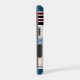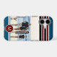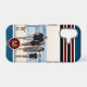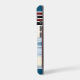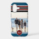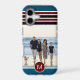 Striped monogram photo case with blue and dark red stripes. The color of the stripes and monogrammed circle can be changed.
