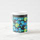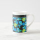 A very stylish Bone China Coffee Mug, with a 'Blue Moons' abstract pattern in bright blues and neon green on a black background; from a handpainted paper collage design by Judy Adamson. You can add text to the plain band at the top or just leave it plain.
