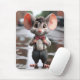 A charming boy mouse character stands in the middle of a wet street, dressed in suspenders and a bow tie