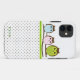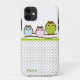 Cute iPhone 5 case, with cartoon graphics of a colourful owl family sitting on branches. The bottom of the case is done in a white with small brown polka dots, with a green satin looking ribbon border. Green text, on the bottom, is ready to personalise for yourself or as a great gift idea.