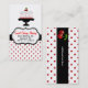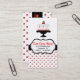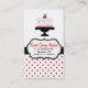 Stylish bakery business card done in red, black, and white, with red and white polka dots, on the bottom front and covering the back of the card. Sweet graphics of a polka dot cake, with cherries on top, decorates the top front and a black and white decorative text frame is in the middle. Cute red cherries decorate the black text band, on the backside of the card. All text front and back is ready to personalise for your baking business.