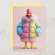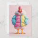 A whimsical and vibrant 3D-rendered chicken stands confidently, dressed in a fashionable oversized puffer jacket in pastel shades of blue, pink, and yellow, complete with a fur-trimmed collar. The playful design blends humour and high fashion, making this modern chicken look ready for a winter runway.