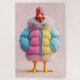 A whimsical and vibrant 3D-rendered chicken stands confidently, dressed in a fashionable oversized puffer jacket in pastel shades of blue, pink, and yellow, complete with a fur-trimmed collar. The playful design blends humour and high fashion, making this modern chicken look ready for a winter runway.