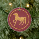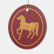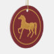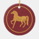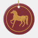 A stylish ornament with a gold-coloured horse on a deep red background. The horse motif was painted by hand by Judy Adamson.