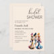 Modern and stylish Bridal Shower invitation featuring watercolor painting of three elegant, hourglass-shaped women wearing form-fitting and lightweight dresses of vibrant colours and patterns. Their hair styles and colour palettes differ and each carries a small backpack, adding a touch of casual charm to the scene.