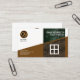 Card features an elegant dual toned side brick wall. The brown layer at the bottom is accentuated by a white framed window. Above this is a dark green luminous brick design which houses your prestigious name and job title. Westwards to this is a faux gold logo of a hammer which you can use. Below it is a slogan option. The contact details are south of this towards the baseline.