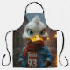 The image shows an anthropomorphic duck with a confident expression, big blue eyes, and white feathers. It is dressed in a denim jacket, a red shirt with the word “Genis” and the number 93, along with an orange scarf. The urban background, with streetlights glowing in a rainy atmosphere, adds a modern and city vibe to the scene.