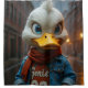 The image shows an anthropomorphic duck with a confident expression, big blue eyes, and white feathers. It is dressed in a denim jacket, a red shirt with the word “Genis” and the number 93, along with an orange scarf. The urban background, with streetlights glowing in a rainy atmosphere, adds a modern and city vibe to the scene.