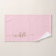 Modern Elegant Chic Gold Monogram Name Signature Script Custom Personalised Blush Pink Bath Towel Set. This delicate design featuring custom name in a cursive hand lettered swash tail font calligraphy (or typography) in gold on blush pink or baby pink colour background. Great stylish feminine housewarming gift, also for birthday, wedding, bridal shower, mother’s day, sweet 16 birthday party, bachelorette party, anniversary gift and for graduation party and It’s for the girl who likes stylish elegant things.