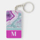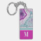 Stylish Teal Magenta Pink Agate Stone Monogram Keychain. Agate crystals and geodes continue to be a favourite trend! This print features and up close image of a teal or turquoise and purple pink or fuchsia geode stone, complete with little crystals and white banding. Accented with vibrant colour blocking to give it a modern and trendy look. Add your initial to make it your own.