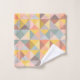 This stylish bath towel set features a classic geometric shapes pattern in a beautiful autumn earth tones colour palette of grey, blush, yellow, and sage green.