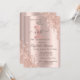 A modern, chic and glamourous invitation with glitter drips and silver tiara on a rose gold background.