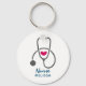 A personalised keychain with "Nurse" written in a cool script font. A little pink heart and a simple grey stethescope illustration.