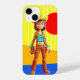 This striking image features a stylish cowgirl standing confidently against a backdrop of bold, geometric colours. Her outfit blends classic Western elements—complete with a cowboy hat, belt, and boots—with a fresh, modern twist. The bright yellow background, accented with a large red sun and bold blue foreground, gives the image a vibrant, almost surreal feel.