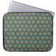 A stylish Laptop Sleeve, with a pattern of small red and green hearts on a dark teal background in a 'Folk Art' style. and black binding.