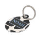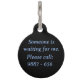 A modern pet ID tag with a white background and solid black leopard spots. The front showcases a black name panel outlined with blue lines, with your dog’s name displayed in blue lettering. The back features a black background with blue text for a customizable contact message and phone number. Clean, high-contrast, and designed for everyday safety.