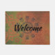 A variety of orange shaded lotus mandalas on a green and orange backdrop with a black damask design in the center where the word welcome is centered. Stylish welcoming vibes