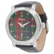 Stylish leather strap wrist watch, with the classic red, blue, green, black, yellow and white clan MacLean tartan plaid pattern, on the face, with white numbers and dots for the hours.  White custom text reads MacLean, and can be personalised to read what you want.