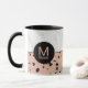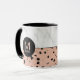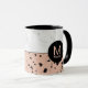 A stylish personalised mug featuring a trendy rose gold pattern with black spots over a white marble pattern. A round black frame encircles your monogram and name on both sides of this item. Edit the sample text with your desired text.