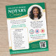 Marketing flyers are a great way to advertise your notary business and attract new clients. This stylish design showcases your photo inside a circular frame, with an elegant gold gradient. Personalise the template with your name, credentials, contact information, accreditation logos, services, and a convenient appointment-scheduling QR code. The text can be customised to suit your business. Perfect for a Notary Public, Loan Signing Agent, Mobile Notary, Certified Notary Trust Delivery Agent (CNTDA), Apostille or other legal profession. Printed colours: green, gold, black and white. Shop the online collection for more popular product ideas and supplies, designed for notaries!