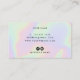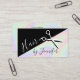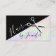 Gorgeous hairstylist business card design featuring colorful faux holographic texture, black color block, scissors and elegant calligraphy font.