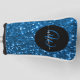 A golf head cover decorated with a classic and elegant monogram and name in blue on a stylish black circle together with faux blue glitter.