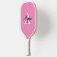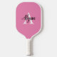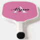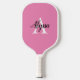 Stylish Monogram Script Pink Pickleball Paddle featuring an elegant arrangement of name and monogram initial on a pretty pink background. The pickleball paddle is easy to personalise in the online personalisation template before ordering. The text automatically copies across to the other side of the paddle to show the identical name and initial on each side.