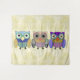 Three very cute an somewhat eccentric owls in all their finery will cheer you through your day. What could be cuter than owls wearing clothes and looking so serious? The background is a repeating pattern of whimsical skinny trees and leaves.