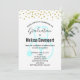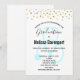 A invitation for a nursing graduation celebration. Designed with faux gold confetti dots along the top. A pastel blue stethoscope behind the party text. Simple minimalist design.