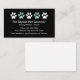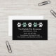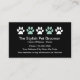 Trendy and stylish pet service business card design with designer green and white coloured paw prints and an organised template of information you can customise to make your own. Created for a pet groomer, pet sitter, dog kennel, or pet boutique.