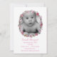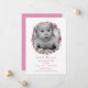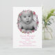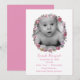Pretty baby girl announcement done in crisp white with vintage artwork of a pink rose wreath, with cutout for baby's photo. Personalise the pink text with your baby's birth information. Beautiful way to show off your newborn to friends and family.