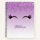 A notebook with a trendy stylish design. The background is a purple gradient colour with an image of fake sparkling glitter dripping down from the top. A pair of girly cute eyelashes underneath the glitter image.