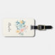 A luggage tag with a pretty watercolor illustration. A flower bouquet with pink and blue flowers surrounded by green leaves and sprigs.
