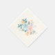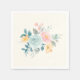 Paper napkins with a pretty watercolor illustration. A flower bouquet with pink and blue flowers surrounded by green leaves and sprigs.