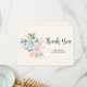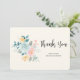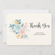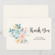 Thank you card with a pretty watercolor illustration. A flower bouquet with pink and blue flowers surrounded by green leaves and sprigs.