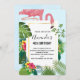 A birthday invitation with a cute and whimsical pink flamingo. Surrounded by green tropical leaves and red hibiscus flowers. A square gold gradient frame in the centre.