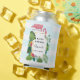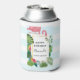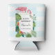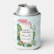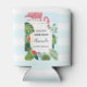 Can cooler with a cute and whimsical pink flamingo. Surrounded by green tropical leaves, and red and yellow hibiscus flowers. A rectangle shaped, gold gradient frame in the centre.