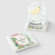 A stone coaster with a cute and whimsical pink flamingo. Surrounded by green tropical leaves, and red and yellow hibiscus flowers. A rectangle shaped, gold gradient frame in the centre.
