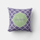 A stylish dusty purple quatrefoil patterned square throw pillow with a scalloped badge in soft green that you can personalise by adding your name and monogrammed initial to. This is part of the Ultra Violet and Nile Green Spring Collection.