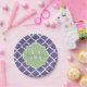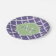 Stylish dusty purple quatrefoil patterned paper plates with a scalloped badge in soft green that you can personalise by adding your name and monogrammed initial to. This is part of the Ultra Violet and Nile Green Spring Collection.